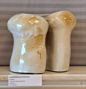 Lena arbetar med drejning, ringling och kavling. Hon tycker formen ska stå i centrum och jobbar med glasyrer och oxider.