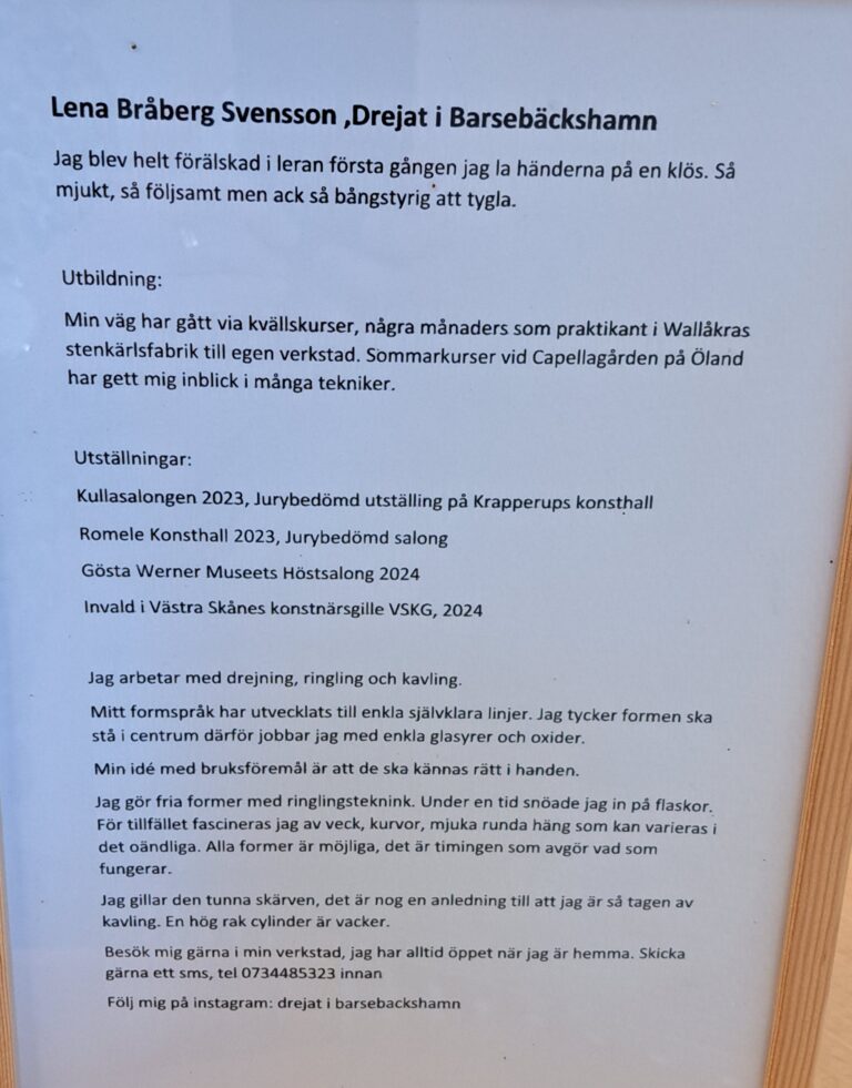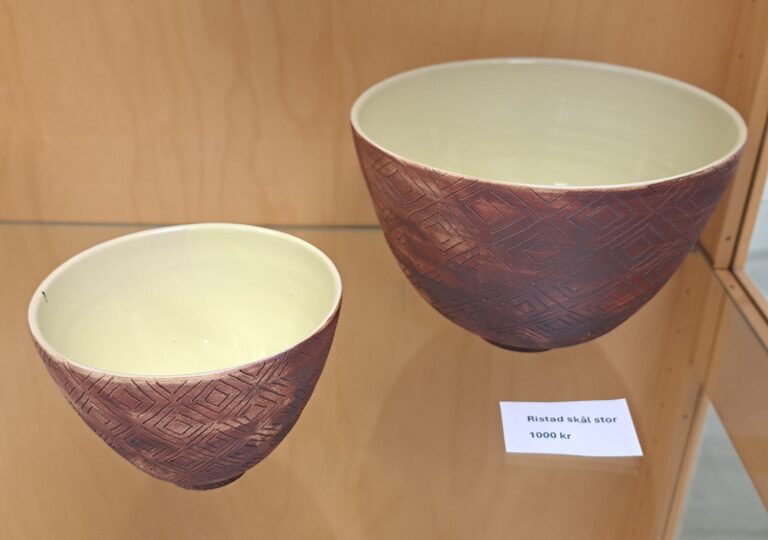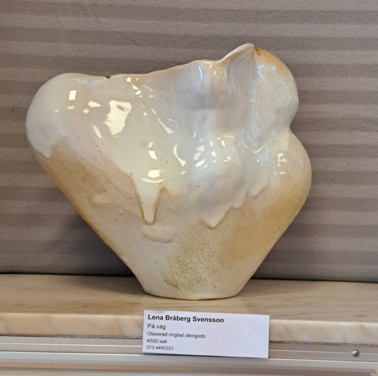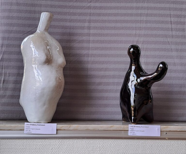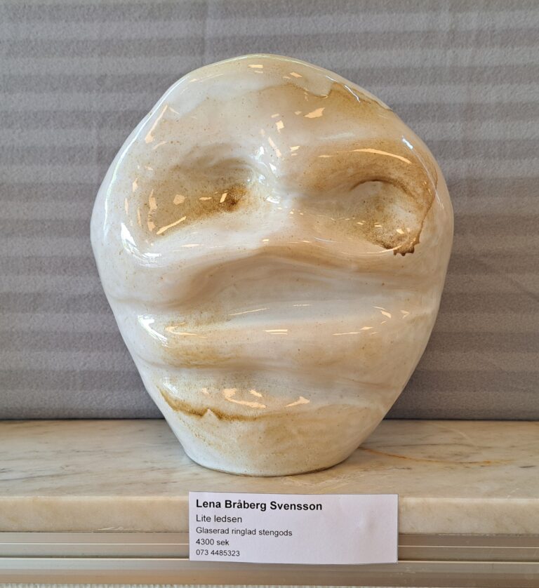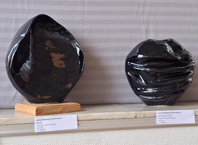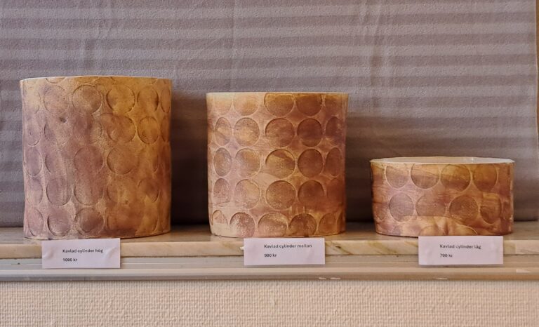 Lena arbetar med drejning, ringling och kavling. Hon tycker formen ska stå i centrum och jobbar med glasyrer och oxider.