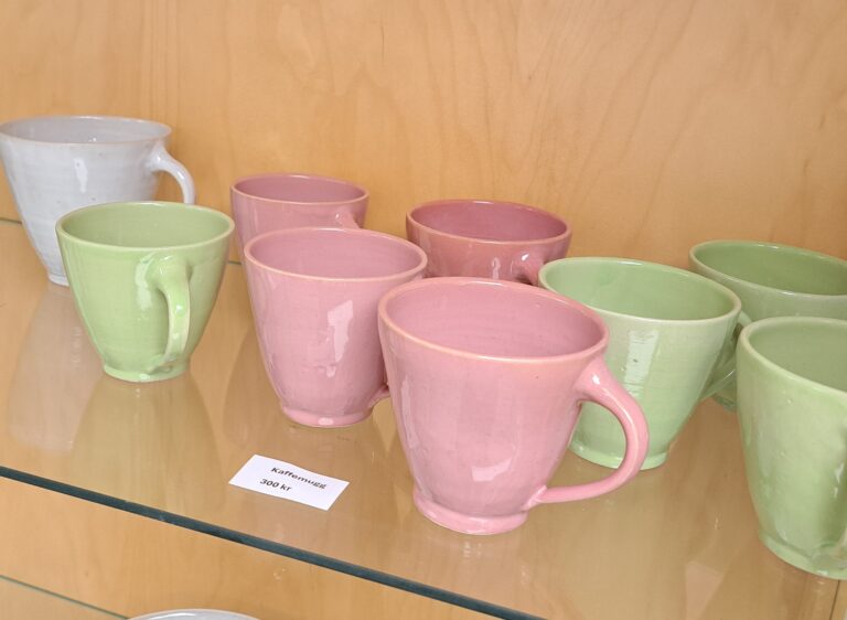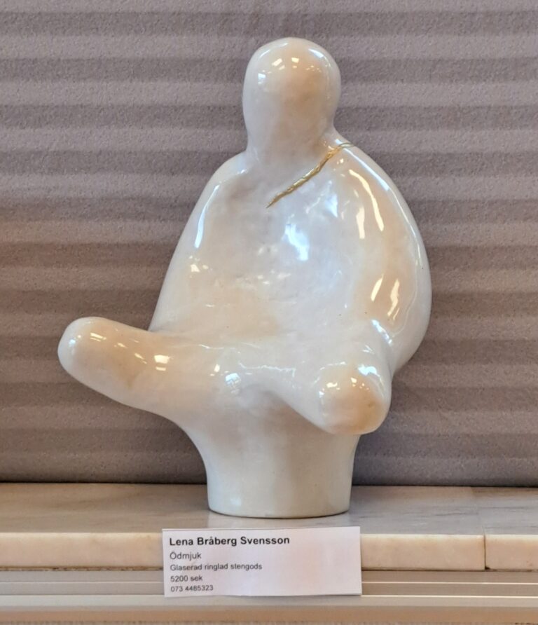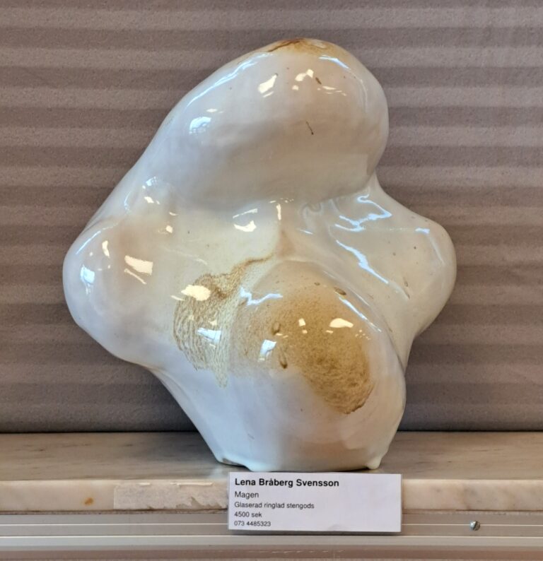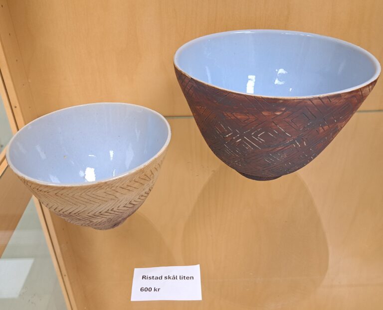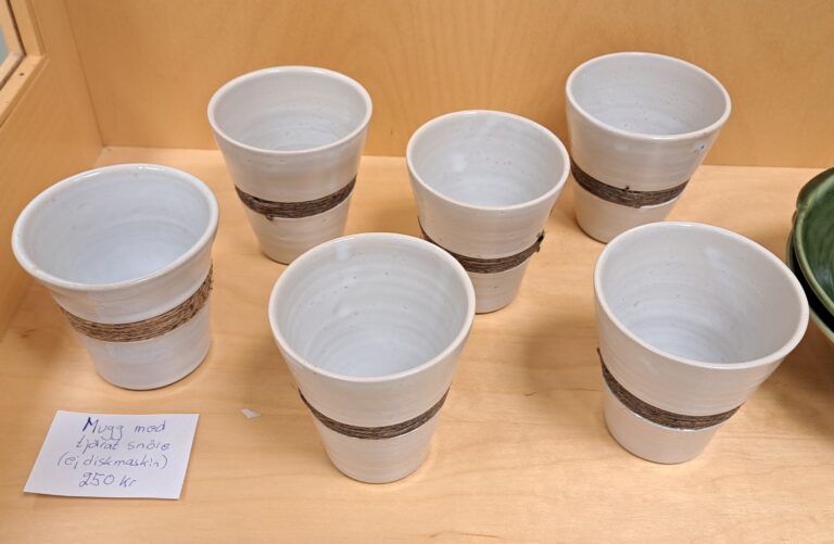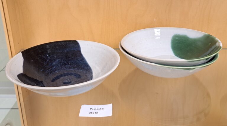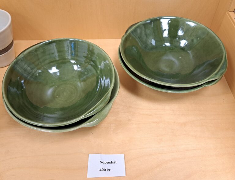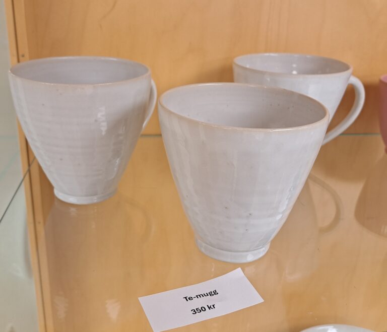 Lena arbetar med drejning, ringling och kavling. Hon tycker formen ska stå i centrum och jobbar med glasyrer och oxider.